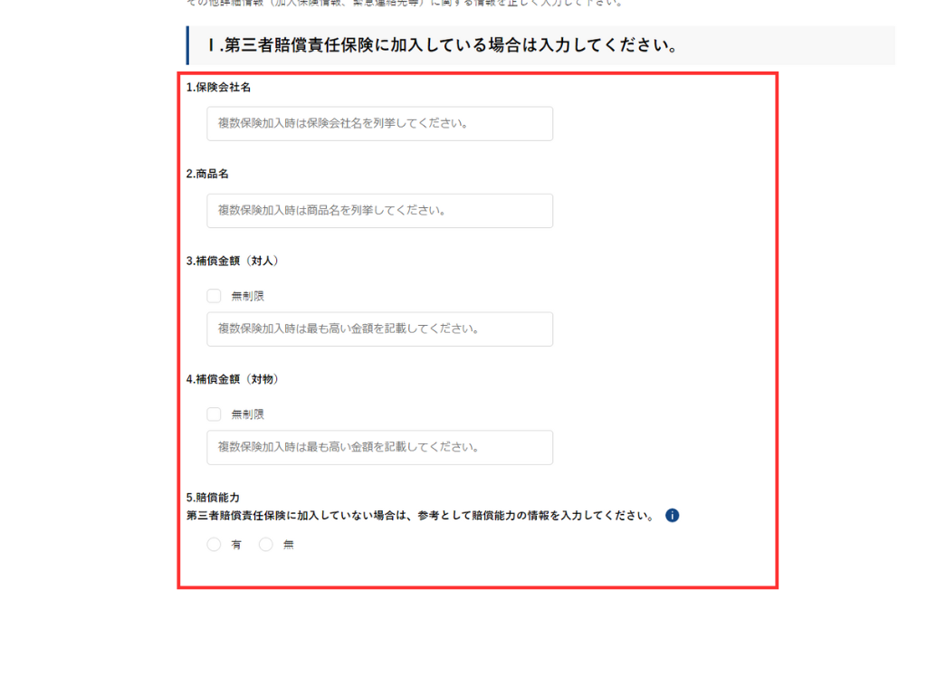 | 保険契約 | 損害賠償保険の有無と内容 |