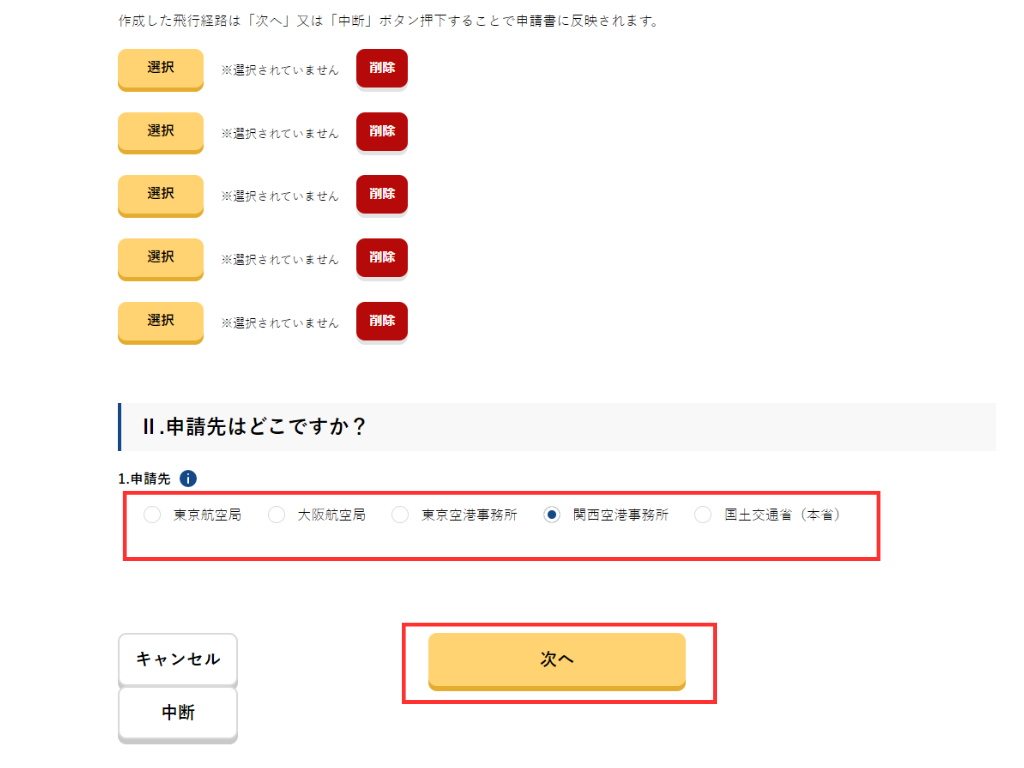 飛行する申請内容に応じて、DIPS2.0で以下の提出先から選びます。