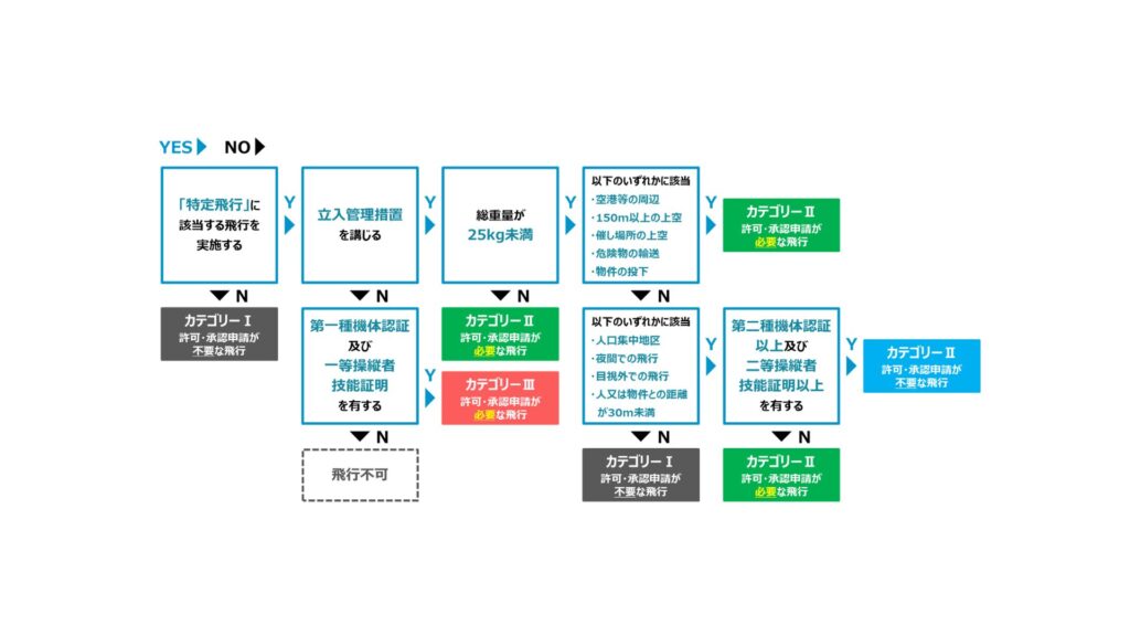カテゴリーについて、どのような飛行が該当するのか、以下のチャートを参考にすると、わかりやすいです。