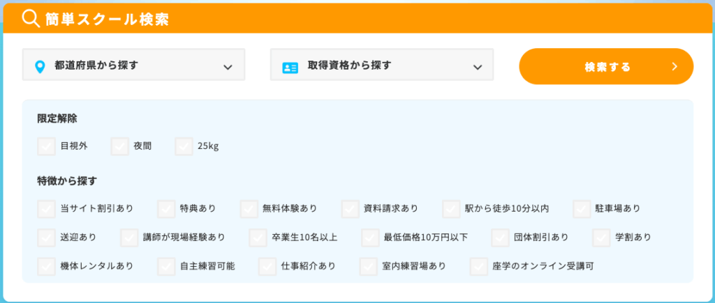 簡単スクール検索で、あなた希望する条件をチェックするだけで簡単検索が可能です。