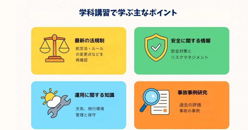 これらの学習で、安全にドローンを飛行させるための知識と技能の維持・向上が学科講習の目的です。