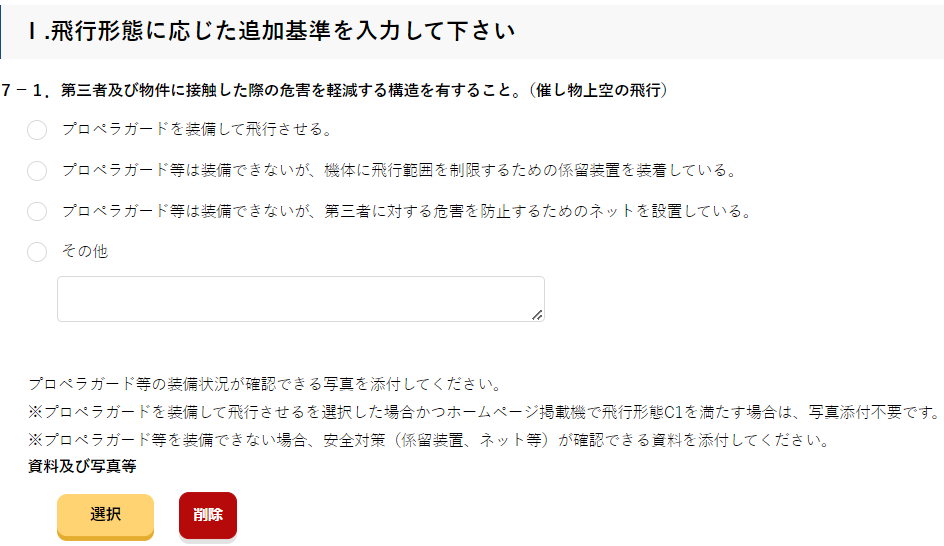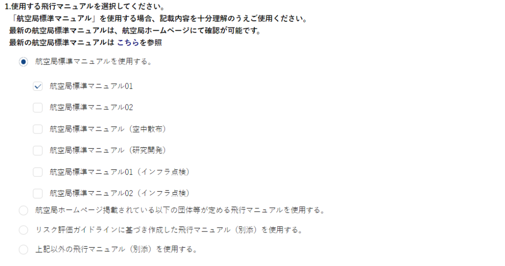 標準マニュアルを使用する場合、個別申請時は、「航空局標準マニュアル01 」を添付してください。