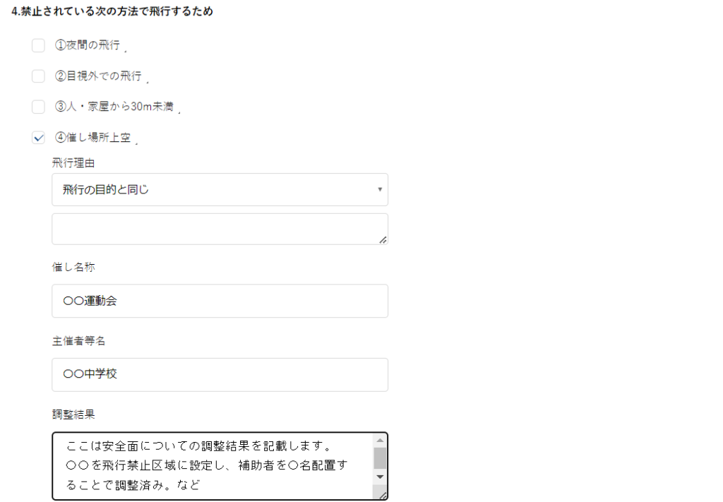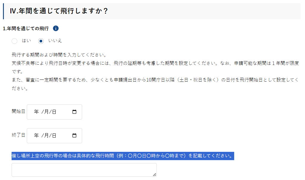 イベント上空の場合は、飛行日時を具体的に記載します。