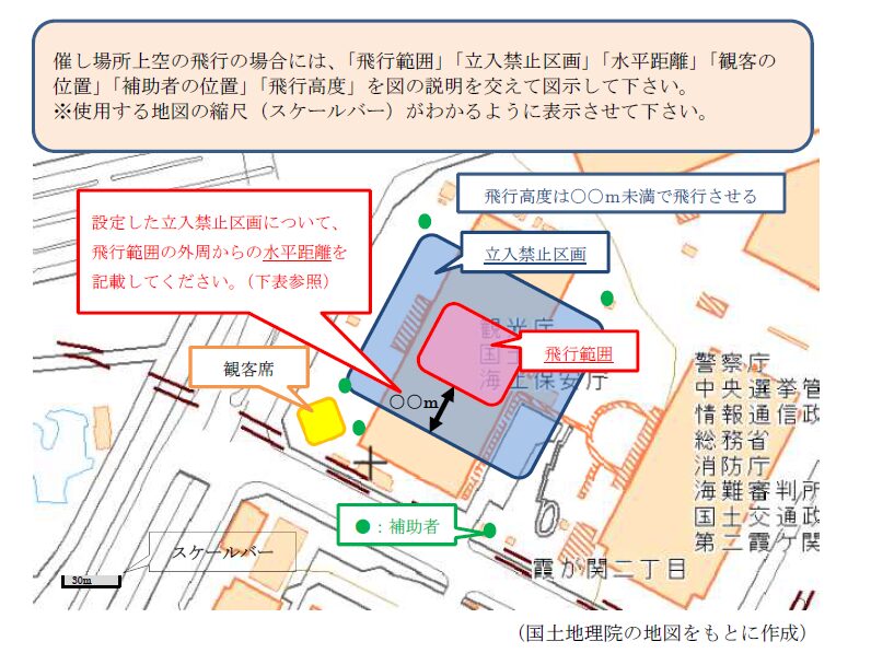イベント上空の飛行の許可申請時には、飛行経路や立入禁止区域を明示しなくてはいけません。