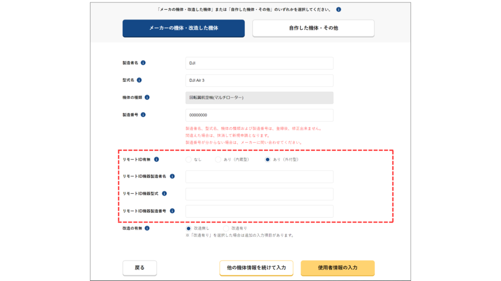 DIPS2.0に機体登録がまだの場合は、情報を登録します。
