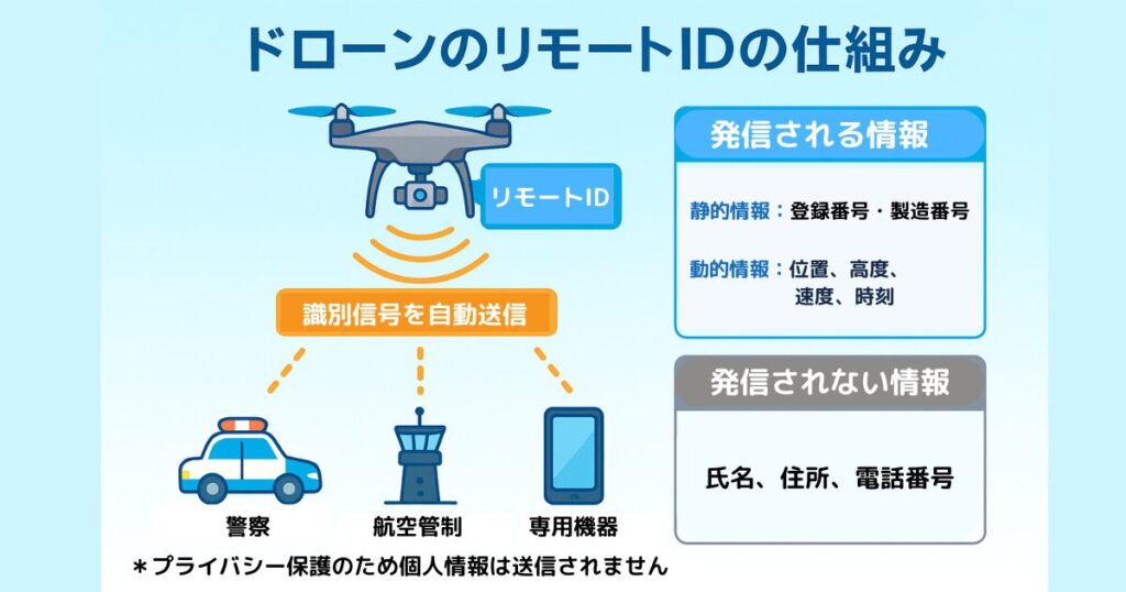 これにより、警察や航空管制当局は、飛行中のドローンが誰のもので、どこを飛行しているかをリアルタイムで把握できます。