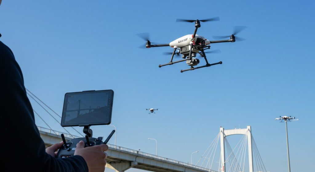 目視外飛行の活用は、河川監視や鉄道施設の点検、寒冷地での長距離飛行など多分野に広がっています。