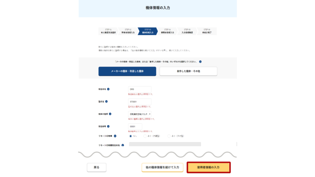 この記事では、実際の機体登録の入力画面を紹介しながら解説していきます。