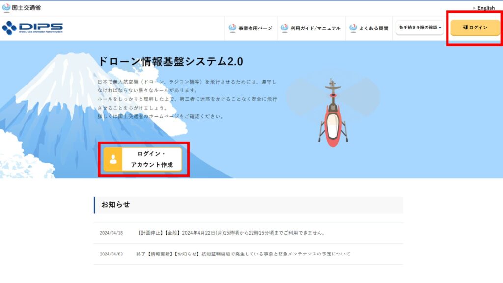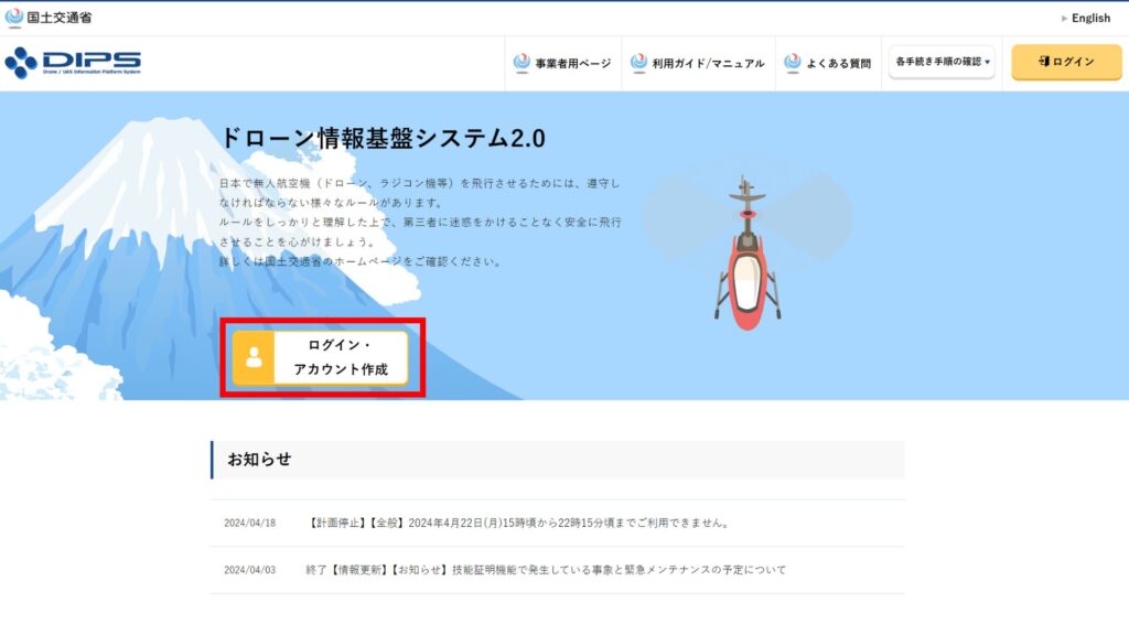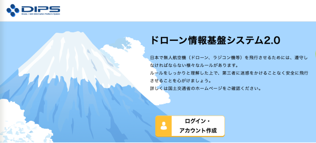ドローンの機体登録は、国土交通省のドローン情報基盤システム2.0、「通称DIPS2.0」から行います。