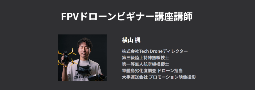 本講座の講師は、TechDroneで映像ディレクターを担当し、FPVドローンを使った撮影も行う横山さんです。