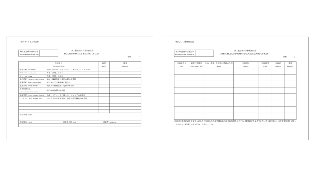 航空法により、飛行前点検の実施と飛行日誌への記録が義務付けられています。