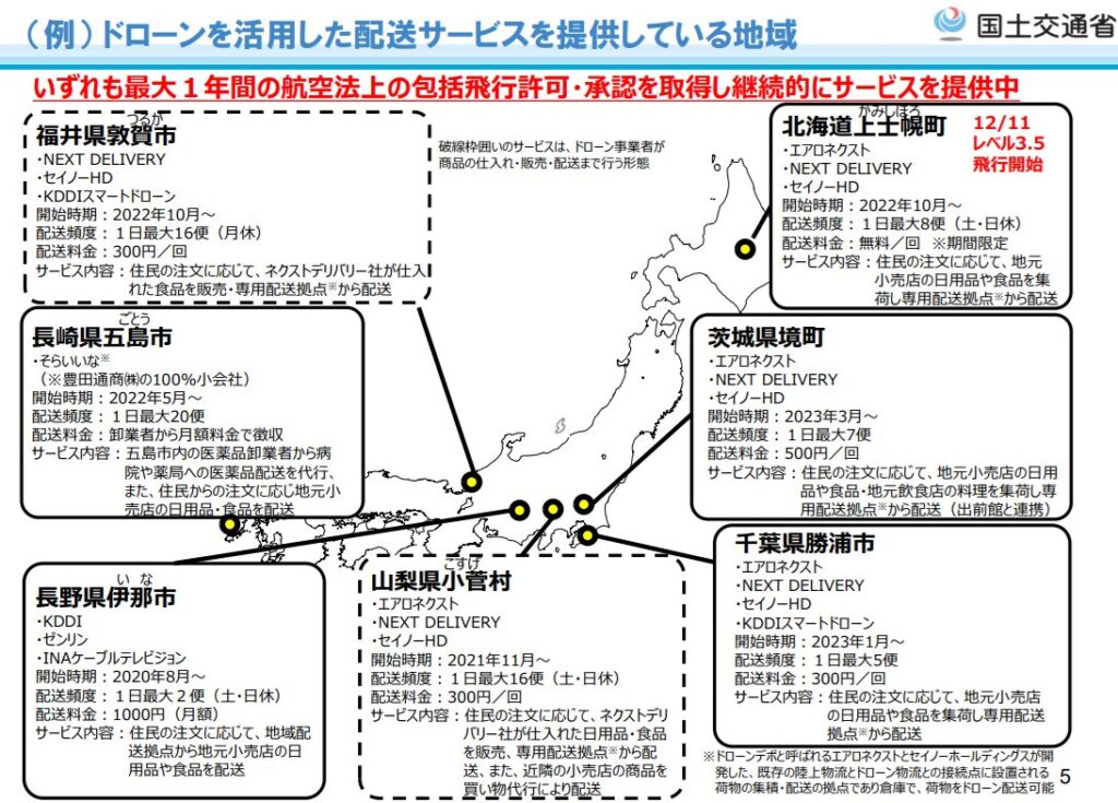 過疎地域でのドローン配送サービス実現に向け、政府は立入管理措置を緩和するための制度づくりを急ピッチで進め、2024年12月に「レベル3.5飛行」が創設されました。