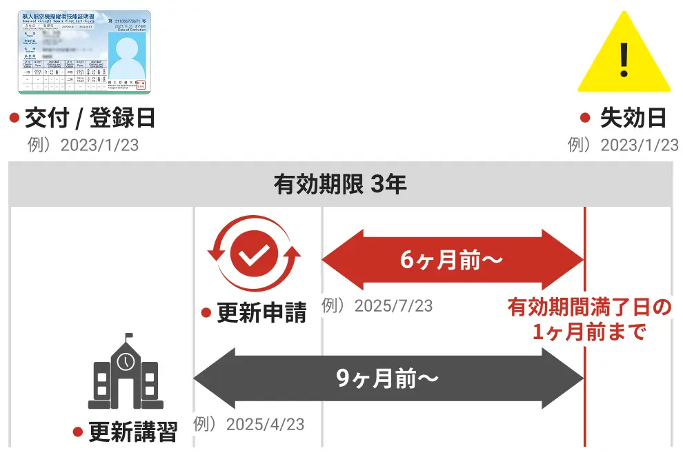 技能証明の更新は、有効期間が満了する日の6ヶ月前から1ヵ月前までの間にDIPS2.0(ドローン情報基盤システム)にて申請が可能です。